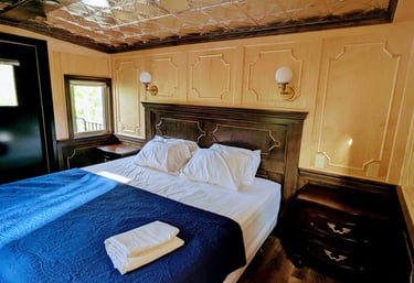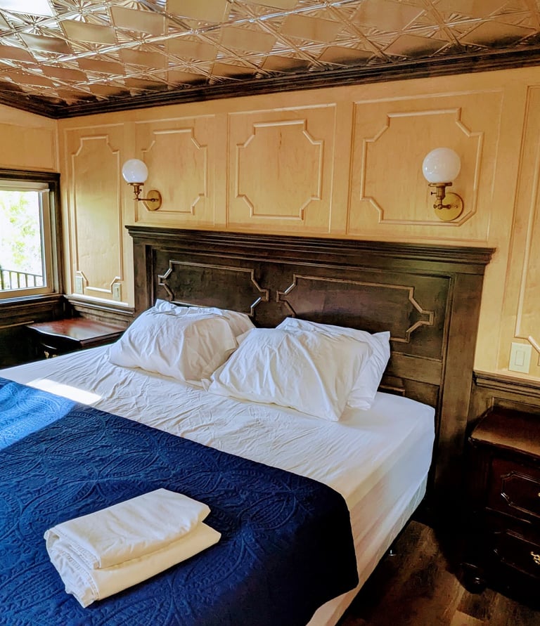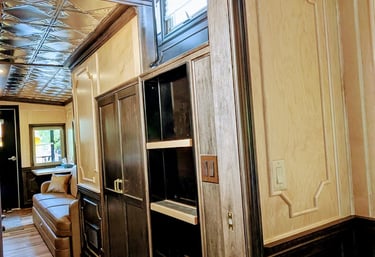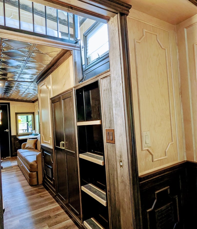 Precise stylish wainscotting, coffered ceiling, stamped tin, built-ins by design